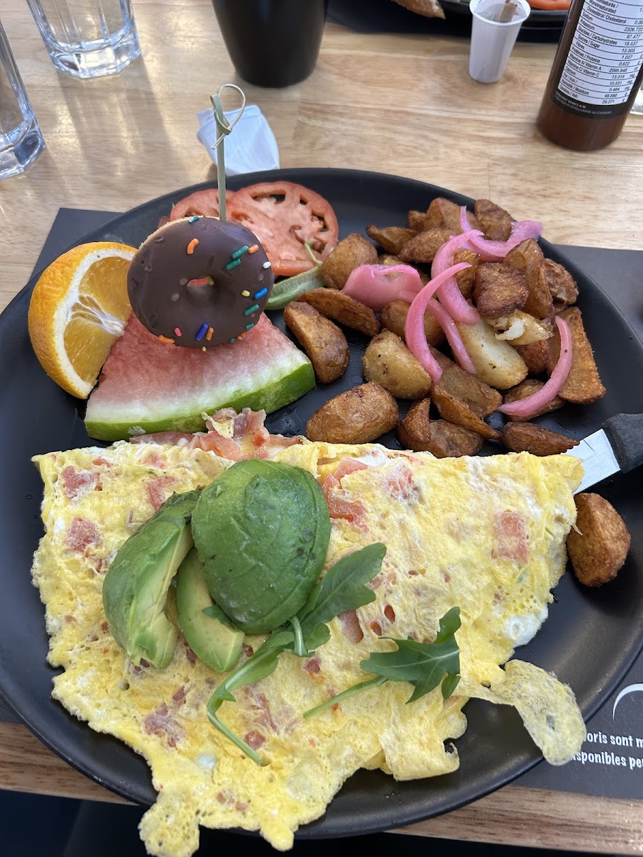 The menu highlights typical breakfast favorites like Deux Œufs Saucisse (two eggs with sausages), Steak et Œufs (steak and eggs), and a variety of Benedict options including a local twist with crab cake or avocado and bacon. Portions are generally satisfying, though some might find them lighter than expected. The offering leans towards hearty but balanced dishes, with vegetarian options like a veggie omelette or vegetarian poutine also present, which adds some welcome variety.